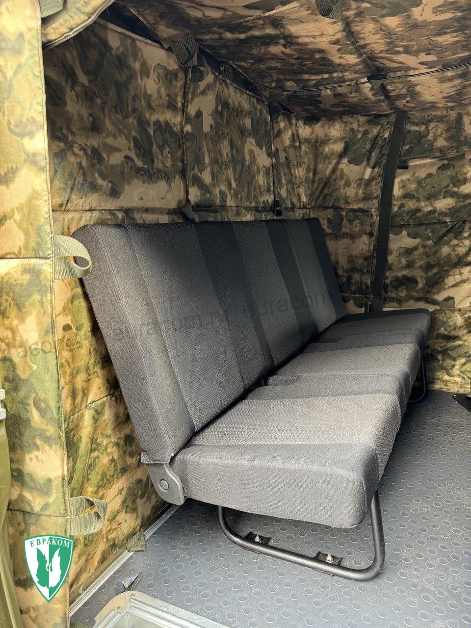 - Кабина 5-ти местная 3-х дверная с трехместным сиденьем по ходу движения вдоль перегородки грузового отсека и 2-мя сиденьями для оформления документов