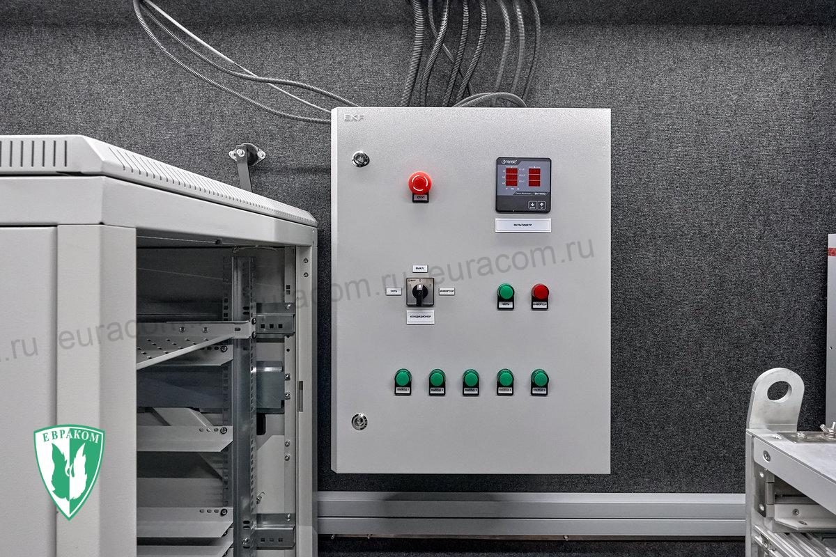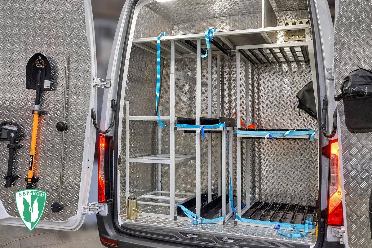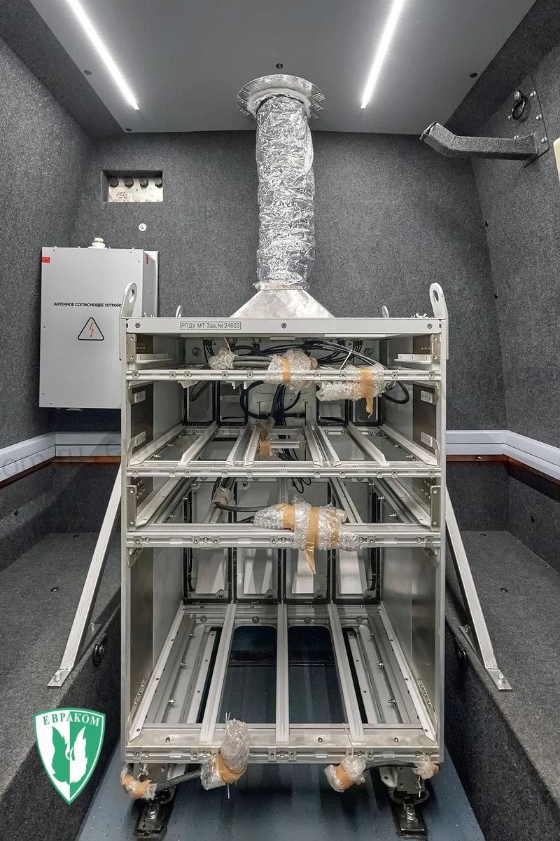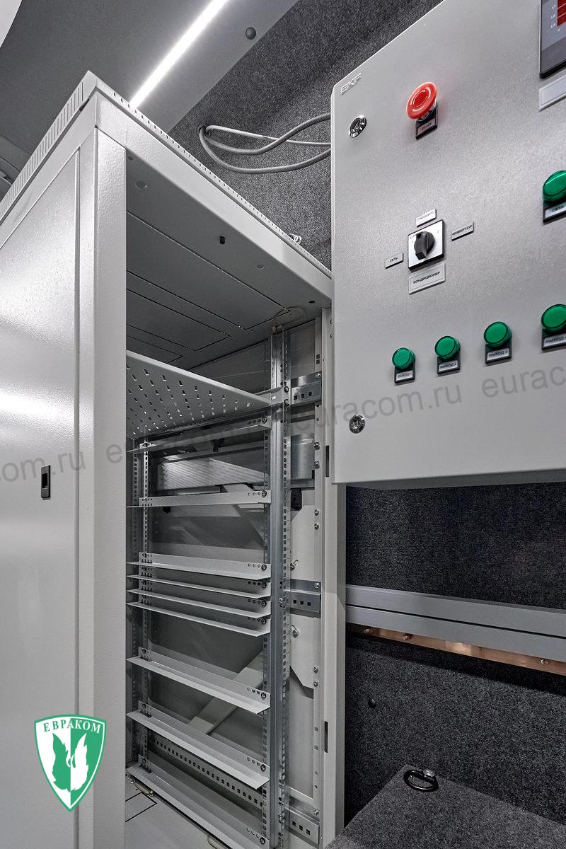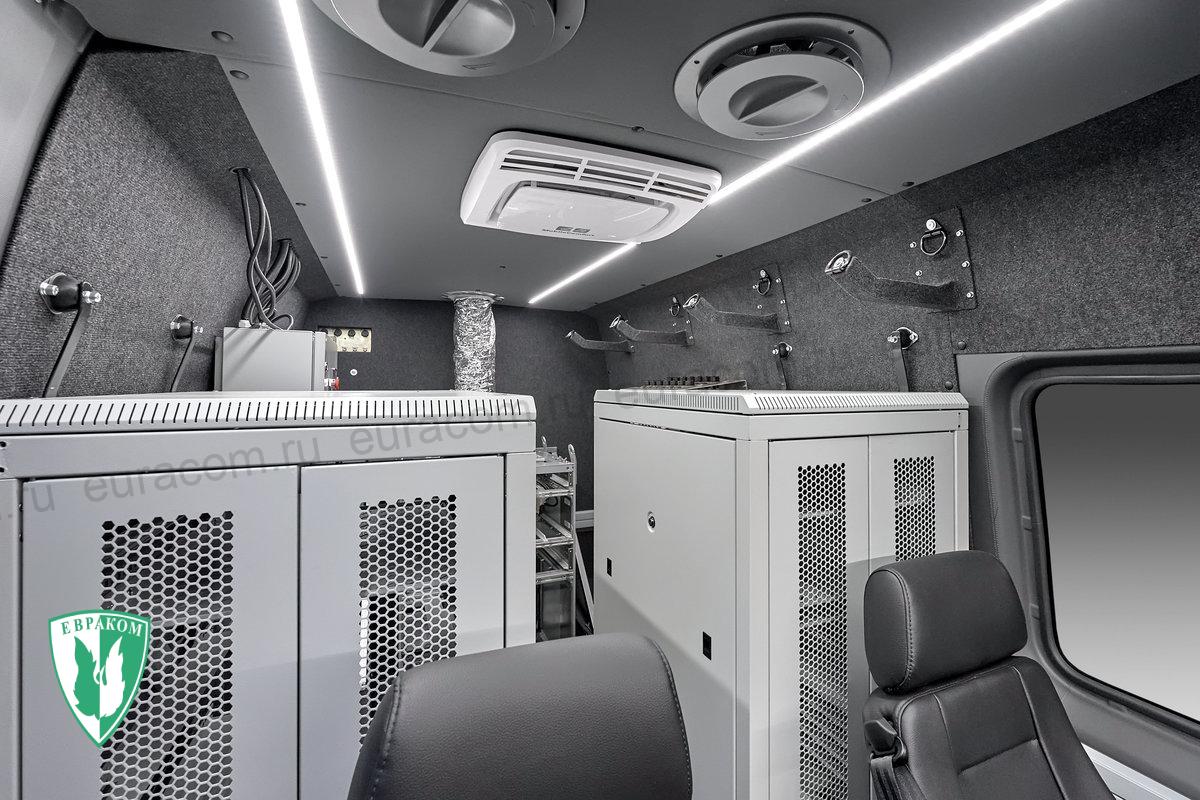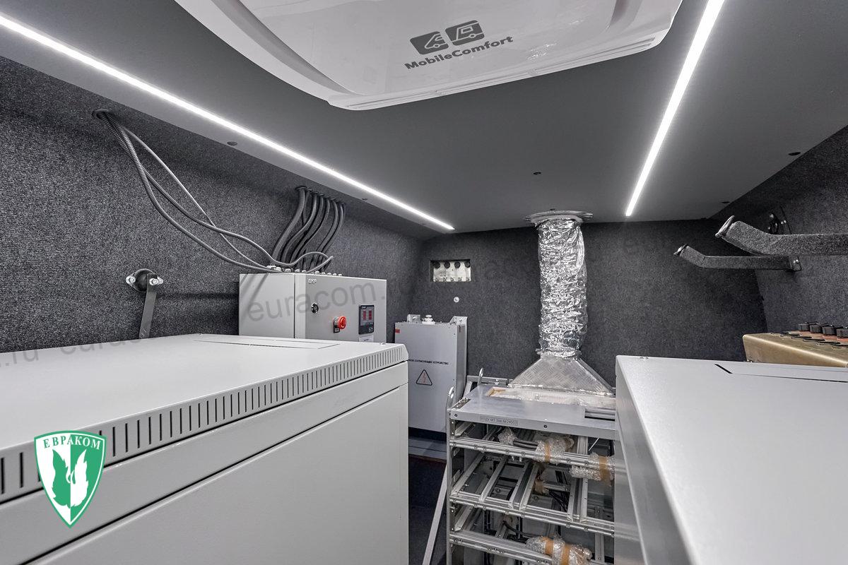 Рабочий отсек оборудован серверными шкафами и оборудованием, обеспечивающим их работу. В задней части — технический отсек со стеллажами и инструментом
