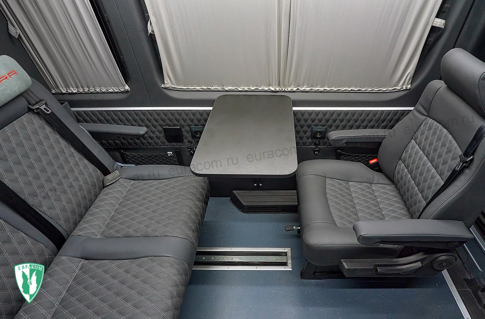 Пассажирский отсек оборудован всем необходимым для удобного расположения 5 человек, трое из которых располагаются на комфортном раскладном диване, а двое — в отдельных “капитанских” креслах. Кресла оснащены трехточечными ремнями безопасности, подголовниками, 2 подлокотника, с регулировкой спинки по углу наклона. Имеют возможность продольного сдвига, и разворота на 180 градусов. При необходимости организации спального места, кресла разворачиваются спиной по ходу движения, диван перемещается по направлению к креслам и полностью раскладывается.Таким образом получается полноценное спальное место рассчитанное на 2-3 человека. Столик, шторки на окнах, кондиционер, отопитель, розетки 220В и USB — всё это стало уже обязательным оснащением комфортных автомобилей, производимых Компанией Евраком. Мини-холодильник, печь СВЧ, чайник, кофе-машина и много-много полезных ящичков и отсеков поражают своей компактностью и удобностью. Они создают ощущения, что сидишь не в автомобиле, а в кают-компании яхты